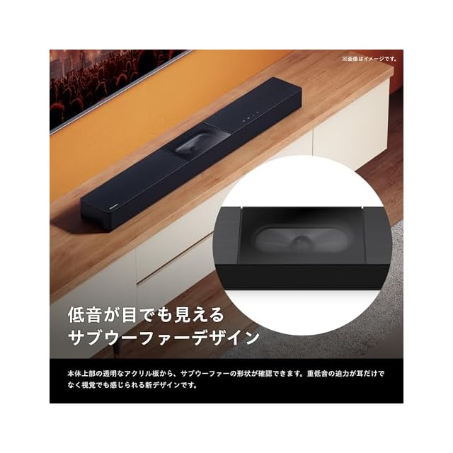【低音が見えるサブウーファーデザイン】本体上部の透明なアクリル板から、サブウーファーの振動が確認できます。重低音の迫力が耳だけでなく視覚でも感じられる新デザインです。