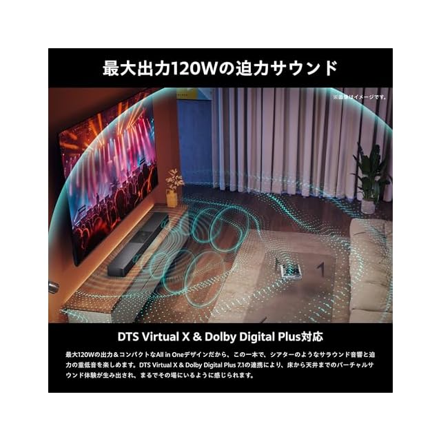【DTS Virtual X& Dolby Digital Plus対応】最大120Wの出力を備え、この一台で、シアターのようなサラウンド音響と迫力の重低音を楽しめます。DTS Virtual X& Dolby Digital Plus 7.1の対応により、バーチャルサウンド体験が生み出され、まるでその場にいるように感じられます。