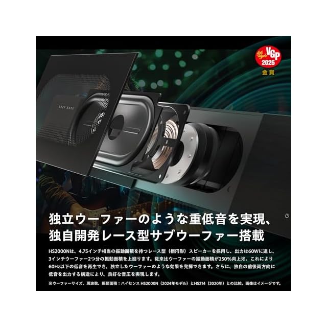 HS2000Nは、4.75インチ相当の振動面積を持つレース型(楕円形)スピーカーを採用し、出力は60Wに達します。当社従来比ウーファーの振動面積が250%向上。これにより60Hz以下の低音を再生できます。さらに、独自の前後両方向に低音を出力する構造により、良好な音圧を実現します。