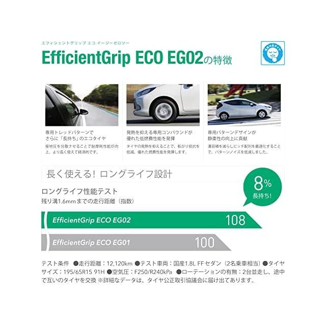 【EfficientGrip ECO EG02 の特徴】 前モデル「EG01」から全ての性能を引き上げた、新しいスタンダードエコタイヤです。優れたロングライフ性能に、低燃費性能と静粛性を備えています。