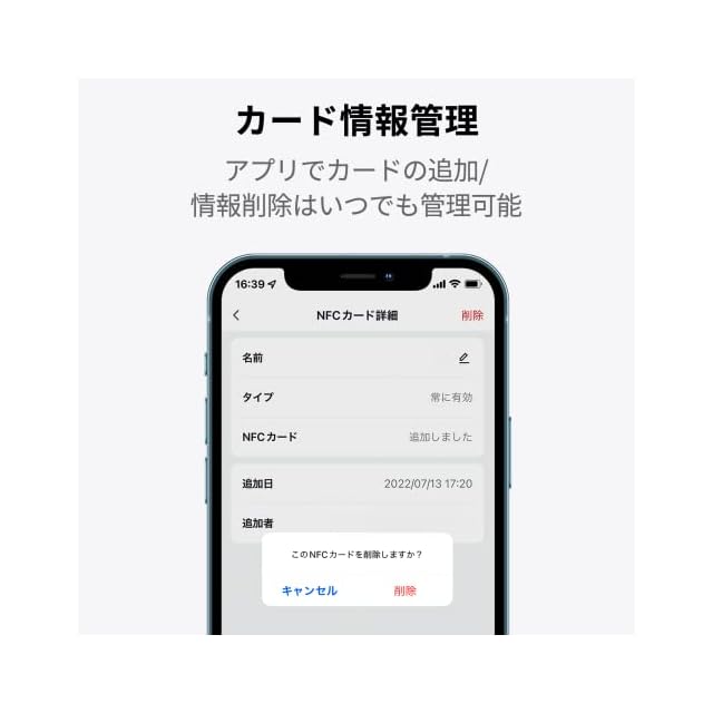 【カードの管理も簡単】専用のアプリでカードの追加/情報削除はいつでも簡単に管理できます。カードを失くしてしまった際は、スマホのアプリからカード情報の削除ができます。同様に、失くしたカードが見つかった際は、再登録も可能です。(※カード情報削除は、キーパッド/指紋認証パッドがBluetoothに接続している必要があります。)