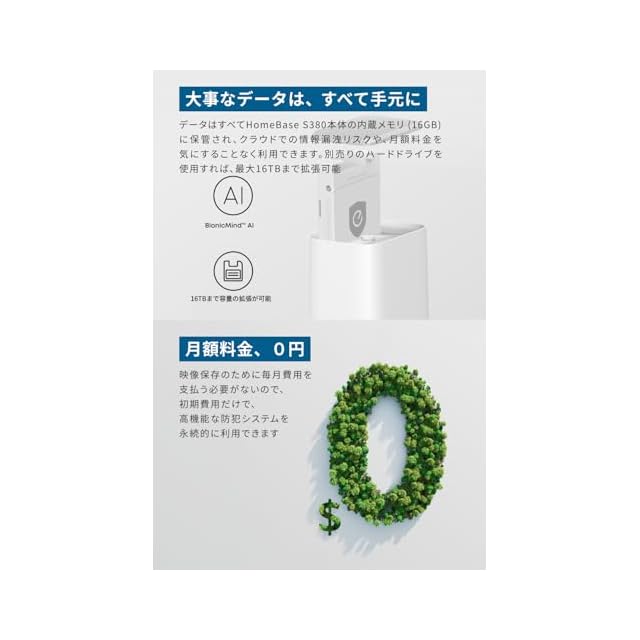 データはローカルストレージに保管で安心:録画データは、クラウドではなくHomeBase S380内の内蔵メモリー (16GB) のローカルストレージに保存でき、ハードドライブ (別売り) を追加すれば最大16TBまで容量の拡張が可能に。ご購入後は月額料金不要です。
