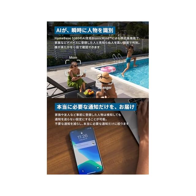 BionicMin搭載:顔認識AI技術により、家族などデバイスに登録した人と見知らぬ人を判別し、誰が来たかを一目で確認できます。※顔認識はクラウドでなく、HomeBase S380で処理されます。顔認識機能を使用するには、動作検知設定の検知対象に「人物(顔認識)」を有効にしてください。