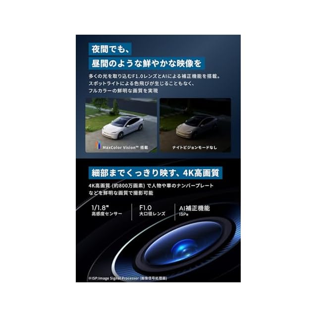 鮮明な夜間撮影:多くの光を取り込むF1.0レンズとAIによる補正機能を搭載。スポットライトがない場合でも、日中のようなフルカラーの鮮明な画質を実現。