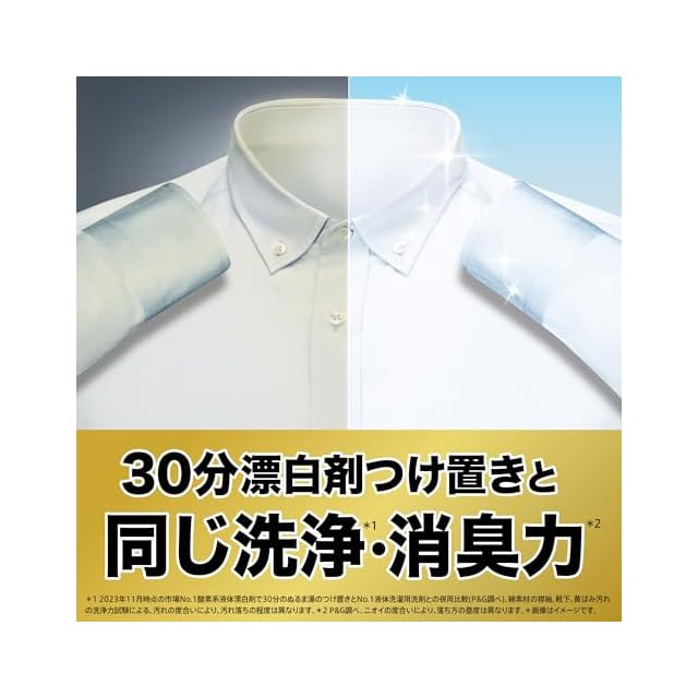 30分漂白剤つけ置きと同じ洗浄・消臭力*(*2023年11月時点の市場No.1酸素系液体漂白剤で30分のぬるま湯のつけ置きとNo.1液体洗濯用洗剤との併用比較(P&G調べ)。綿素材の襟袖、靴下、黄ばみ汚れの洗浄力試験による。汚れの度合いにより、汚れ落ちの程度は異なります。