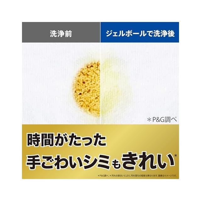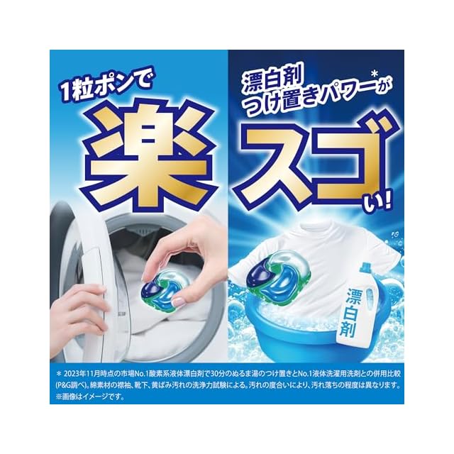 漂白剤つけ置きパワーin* (*2023年11月時点の市場No.1酸素系液体漂白剤で30分のぬるま湯のつけ置きとNo.1液体洗濯用洗剤との併用比較(P&G調べ)。綿素材の襟袖、靴下、黄ばみ汚れの洗浄力試験による。汚れの度合いにより、汚れ落ちの程度は異なります。)の「完全楽スゴ洗剤」ジェルボール
