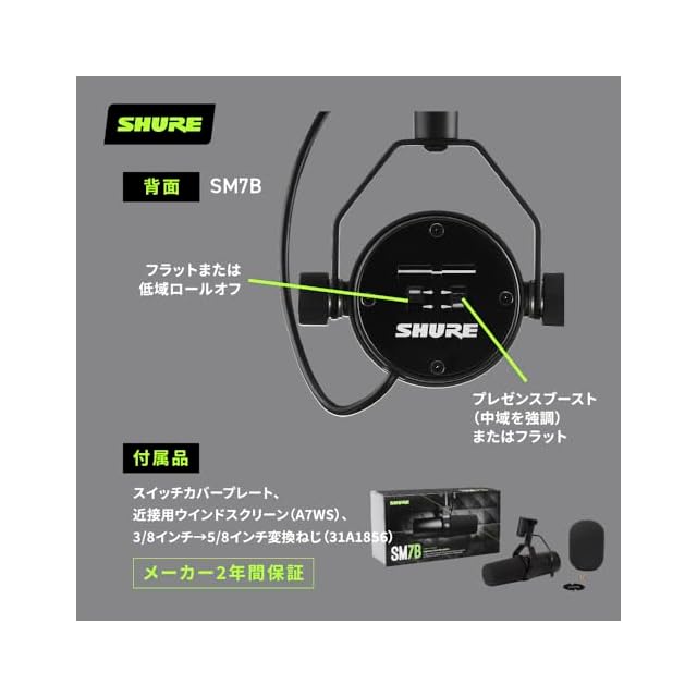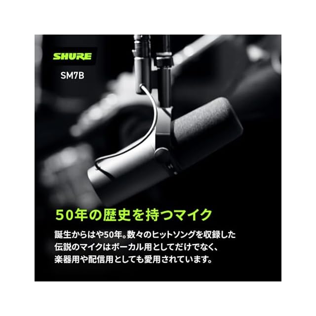 ✅【用途】SM7Bは、スタジオでのナレーション用にデザインされたダイナミック・マイクロホンです。ナレーションのみならず、配信、実況、ゲーミング、ボーカル、レコーディング、ポッドキャスト、DTM、宅録、ギターアンプやアコギ、ベースアンプ、テレワーク等、SM7Bの特性を活かした様々な用途にご使用いただけます。