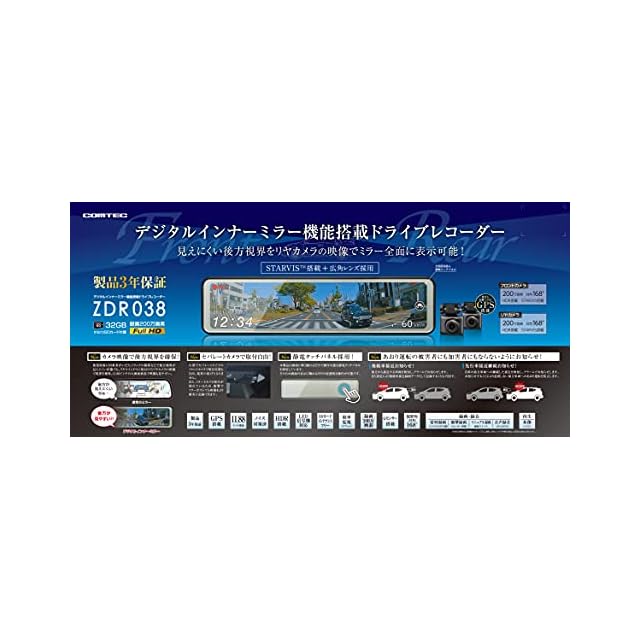 コムテック 車用 ドライブレコーダー搭載電子ルームミラー 前後2カメラ ZDR038 デジタルインナーミラー機能搭載 前後200万画素 FullHD GPS搭載 後続車両接近お知らせ 安全運転支援機能搭載 常時録画 衝撃録画 高速起動 [出張取付サービス対応]