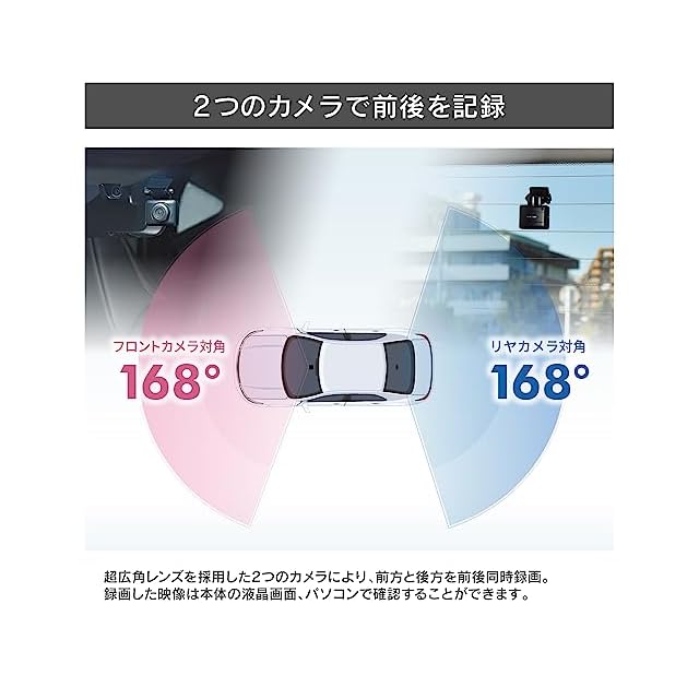 フロントカメラ部仕様:■撮像素子:1/2.8型 CMOSセンサー(STARVIS技術搭載) ■有効画素数:最大200万画素 ■レンズ画角:水平138° 垂直70°(対角168°) ■F値:1.8 ■レンズ材質:ガラス