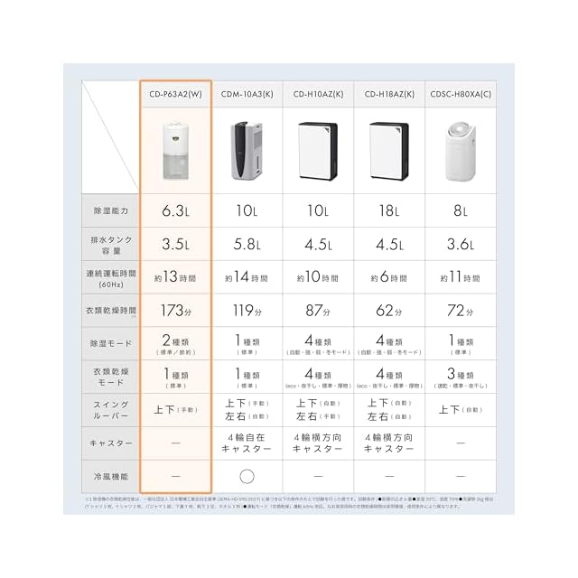 電気代の目安(1時間あたり)(50/60Hz):除湿時=4.3/4.9円、衣類乾燥時=4.3/4.9円(27円/kWh試算)