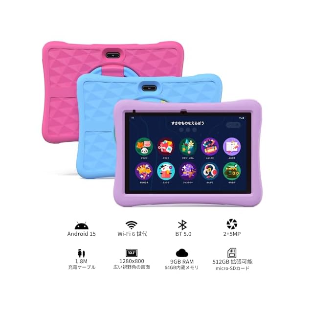 (Android 15 go、RAM 6GB(2+4GB拡張)+ROM 64GB) 2025最新のAndroid15 タブレット 10インチ Wi-Fiモデル は、1.8GHzの5コアCPUも搭載によりもっとスムーズな操作感が実現。3GBのRAMに加え6GB仮想RAMをサポート、9GB大容量RAMを用いて、よりスムーズに操作できます。本体の64GBのROMに加え最大512GBのmicroSDカードをサポート。ストレージで、写真、ビデオ、ドキュメントをさらに保存できます、より多くのメモリの可能性があります。Android 12/13/14 と比較して、Android 15 go の UI は大幅に変更されました。システムの基盤となるコードを最適化し、さらにパーソナルかつ安全に、簡単に操作できるOS。安定したスムーズなOSサービスを体験するだけでなく、LINE/YouTube Kids/Yahoo/Twitterなどのお気に入りのサードパーティアプリケーションをインストールすることもできます。Kids 10 タブレットは、ハロウィーン、クリスマス、新年のお子様への喜ばれるの贈り物です。
