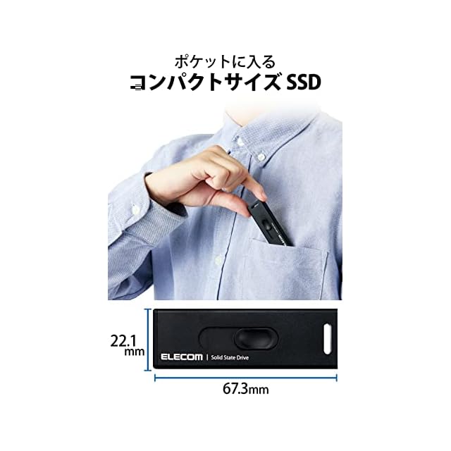 キャップレスでキャップを紛失する心配がなく、スムーズにスライドできる機構のスライド式外付けSSDです。