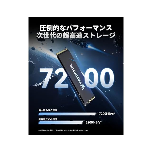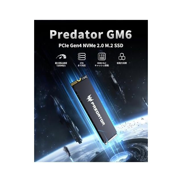 【Acer Predator GM6 SSD】AcerのゲーミングブランドPredatorが誇る最新技術を搭載したGM6 M.2 SSD。最新のGen 4x4 NVMe コントローラと3D QLC NANDが搭載され、最大7,200MB/sの読み取り速度、6,200MB/sの書き込み速度で、ゲームのロード時間を短縮し、大容量データの転送も驚くほどスムーズに。ハイエンドゲーマーやクリエイターの求めるスピードと安定性を実現。