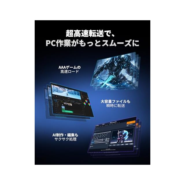 【超高速・作業を快適に】ゲームやアプリの起動はもちろん、ストリーミング配信やキャプチャもスムーズにこなせる圧倒的な応答性を実現。高パフォーマンスなデスクトップPC・ノートPCに最適で、ワークフローを飛躍的に向上させます。