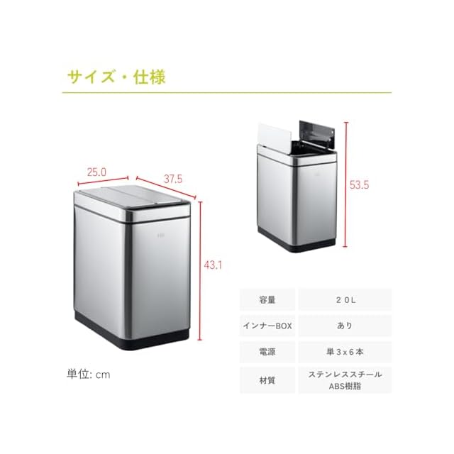 アクティブセンサーを搭載し手のひら程度の高さのみ作動します。中箱に袋を装着し20Lの容積でご使用できます。丸洗いできるので衛生的です。