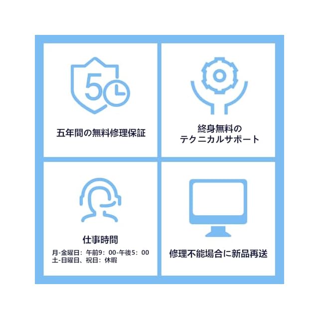 [サポート] 5年間の無料修理・ご購入から1か月以内であれば、問題が発生した場合は無償で交換いたします。終身の技術サポートを提供する。無輝点1年・画面上に無輝点が見つかった、製品に関する問題と不明点がございましたら、お気軽にお問い合わせください。