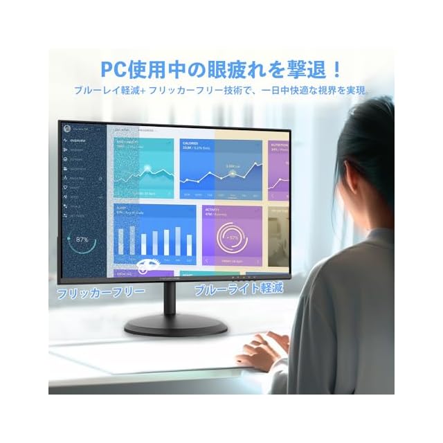 【目の保護】アンチグレア非光沢パネル採用で映り込みを防止。前後 -5°~15° のチルト調整と178°広視野角により、あらゆる角度から快適な視野を確保。ブルーライト軽減&フリッカーフリー技術搭載で、長時間の使用でも目の疲れを軽減します。