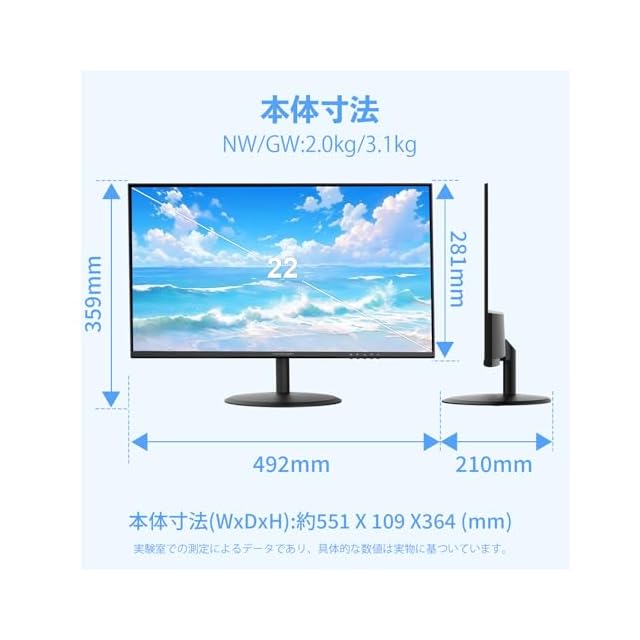 [本体寸法]WxHxD(mm):492MMx191MMx316MM [重量]2.2kg、[梱包寸法]WxHxD(mm):551 X 109 X364 mm、[梱包重量]3.1kg、[消費電力]<24W 省エネルギー。[主な付属品] HDMIケーブル、アダプター、スタンド、取付ガイド(日本語)、説明書(日本語)、書