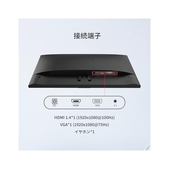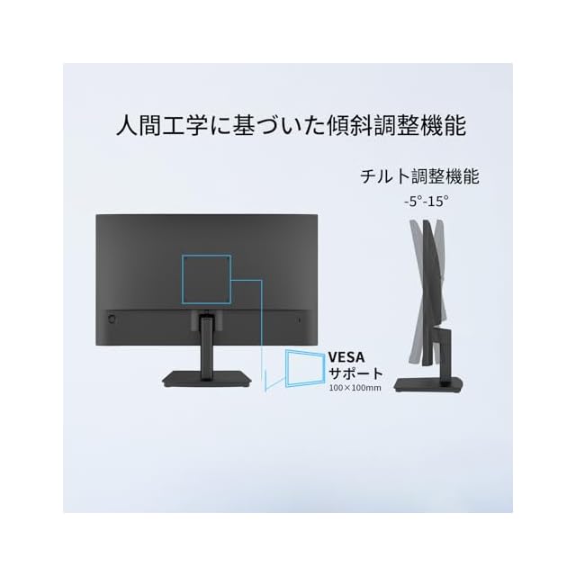 【多様な接続と人間工学設計】HDMI 1.4(1080P@100Hz対応)とVGA(1080P@75Hz対応)を装備し、PCやゲーム機など多様なデバイスに接続可能。VESAマウント対応で、チルト調整機能(-5°~15°±3°)により最適な視野角を簡単に設定できます。