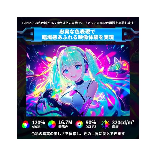 [画面サイズ] 24インチ IPS モニター 、[最大解像度] 1920×1080、[アスペクト比] 16:9、[コントラスト比]1000:1、[輝度] 300cd/㎡ 、[色域] DCI-P3 80%;sRGB 110%、[色深度] 16.7万色、8Bits。