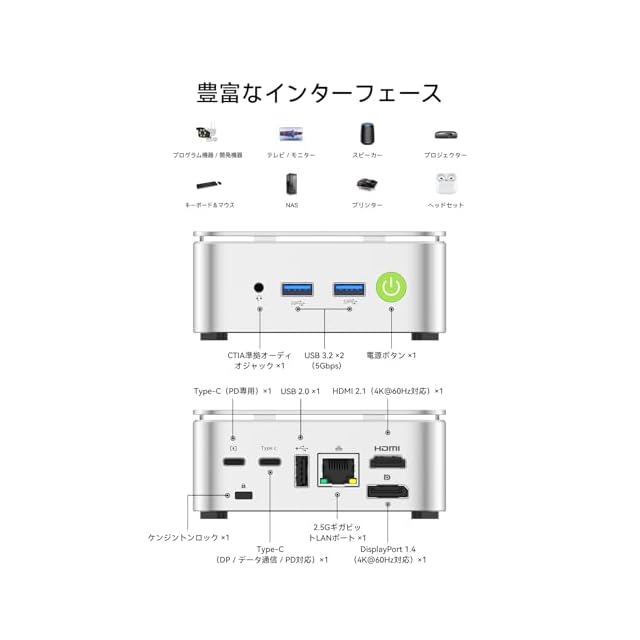 【豊富なインターフェース|周辺機器との接続も自由自在】USB3.2 Gen1×2、USB2.0×1、Type-C×2(PD/DP対応)、HDMI2.1、DP1.4、2.5G LAN、3.5mm音声ジャックなど、多彩なポートを搭載。1つのType-Cは映像出力+給電+データ通信に対応し、もう1つはPD給電専用。モニター、外付けストレージ、キーボード、マウス、スピーカーなどあらゆる周辺機器とスムーズに接続可能です。VESAマウント対応で、モニター裏に取り付けることで配線もすっきり。デスク環境をより快適に整えられます。