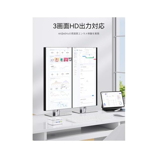 【3画面同時出力対応|HDMI/DP/Type-Cで最大4K出力】GMKtec G10は、HDMI2.1(4K@60Hz)、DisplayPort 1.4(DP++対応)、USB-C(DP Alt Mode)を搭載し、最大3画面同時出力に対応。中でもDPポートは最大4K出力に対応しており、圧倒的な映像美を実現します。複数モニターでの業務効率化、動画編集、株式トレード、デジタルサイネージなど幅広いシーンで活躍。自宅のマルチディスプレイ環境にもすぐ導入可能な、柔軟性の高い映像出力性能が魅力です。