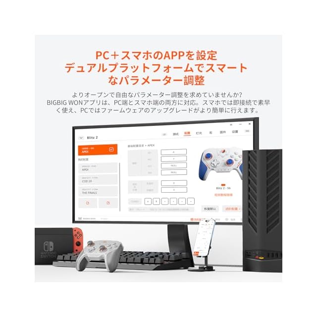 【PC&スマホ両対応でカスタマイズ体験を全面進化】:BLITZ2プロコントローラーはPCとスマートフォンのマルチデバイス対応を実現。スマホアプリで手軽にカスタマイズ,ボタン配置・スティック感度・振動抑制設定など、外出先でも直感的に調整可能,PCソフトで本格チューニング,詳細なパラメータ調整やファームウェア更新に対応し、常に最高のパフォーマンスを維持。双方向連携のスマート設計で、あなただけの究極設定を簡単に構築できます。