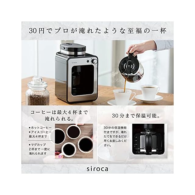 たっぷり淹れられる ホットコーヒー、アイスコーヒーなら4杯、マグカップでも2杯まで一度にドリップできます。30分の保温機能付きですが、淹れたてをできるだけ早くお楽しみください。
