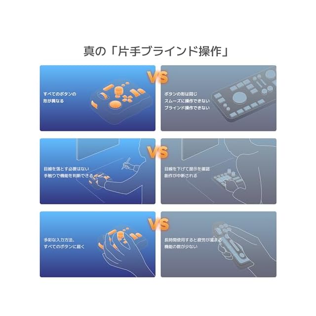 【ノールック片手コントロール】コンパクトなサイズと考え抜かれたボタンレイアウトのTourBoxは片手で楽々操作できます。ボタンとノブ、スクロール、ダイヤルは形が全て異なりますので、作業中に視線を動かして探す必要がありません。初心者もエキスパートもすばやく使いこなせます。