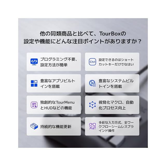【多機能なカスタマイズコンソール】TourBoxは単なるショートカットコントローラーではありません。①豊富なビルトイン機能②オートスイッチ:使用中のソフトウェアを認識してプリセットを自動切り替え③マクロコマンド:マウス、キーボードショートカット、テキスト入力からファイルやフォルダー、リンクを開く操作までワンクリックで実行④Tourメニュー:10種類の機能をワンクリックにまとめるオーバーレイ型メニューなど自社開発した様々な機能を搭載しています。