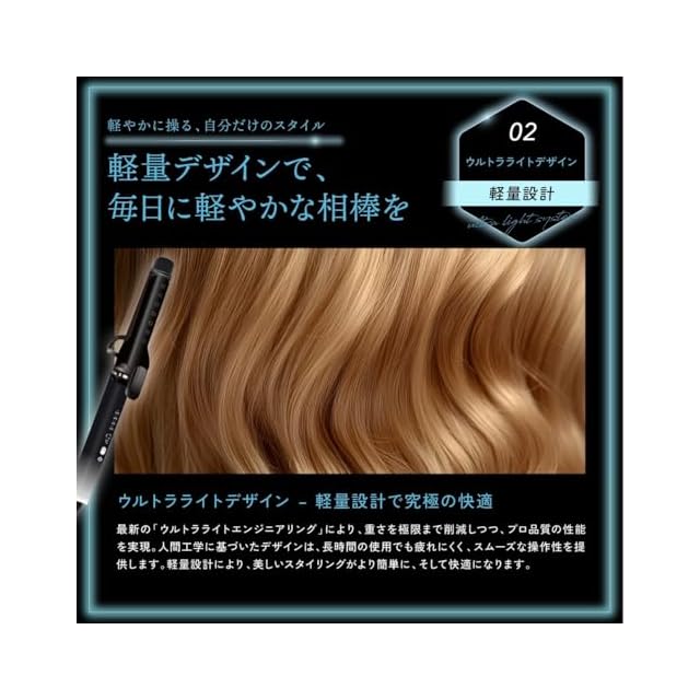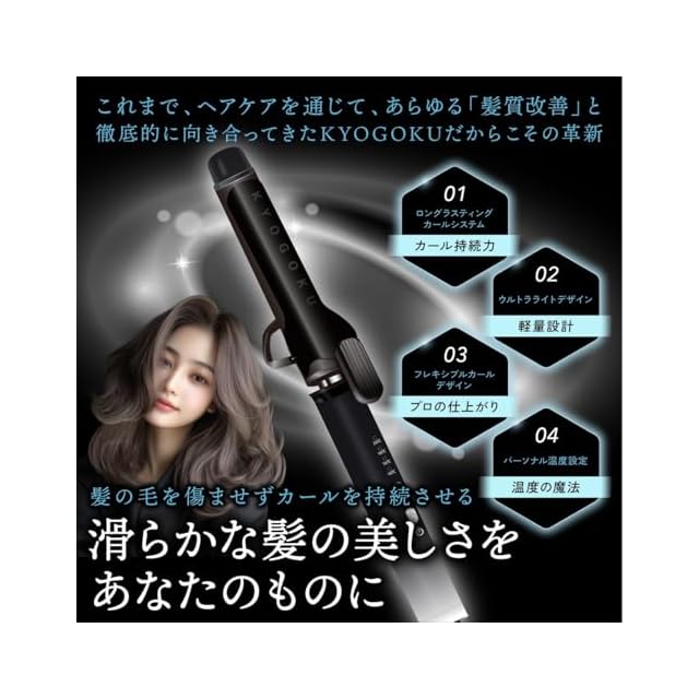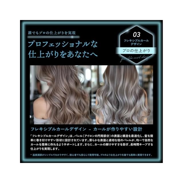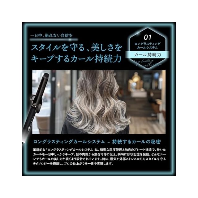 【カール持続力の向上】独自の「ロングラスティングカールシステム」により、熱を均一に伝えながら髪の形状記憶をサポート。湿気や外的ストレスにも強く、一日中カールが崩れにくい仕様です。さらに、温度制御技術により、髪を傷めることなく適切な温度でスタイリングできるため、初心者からプロまで理想の巻き髪を手軽に再現できます。朝のセットが夜まで持続する、忙しい方にも最適な設計です。