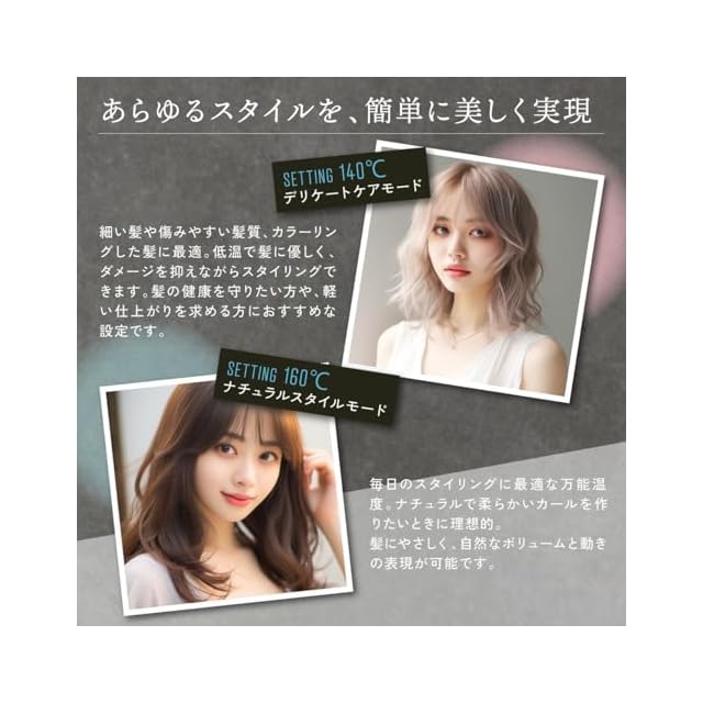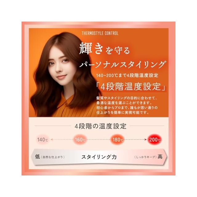 【4段階の温度調整機能(140~200℃)】 髪質やスタイリングの目的に応じて140℃、160℃、180℃、200℃の4段階で温度設定が可能。細い髪やダメージが気になる方には低温設定、しっかりとしたカールを長時間キープしたい方には高温設定がおすすめ。温度を自由に調整することで、熱ダメージを抑えつつ、ナチュラルな仕上がりからしっかりとした巻き髪まで自在にスタイリングが可能です。