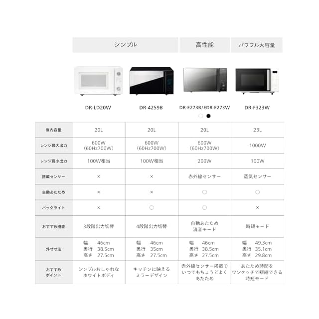【搭載モード】■自動モード:自動あたため/ごはん/飲みもの/おかず/解凍 ■手動モード:600W(50Hz)・700W(60Hz)/500W/200W