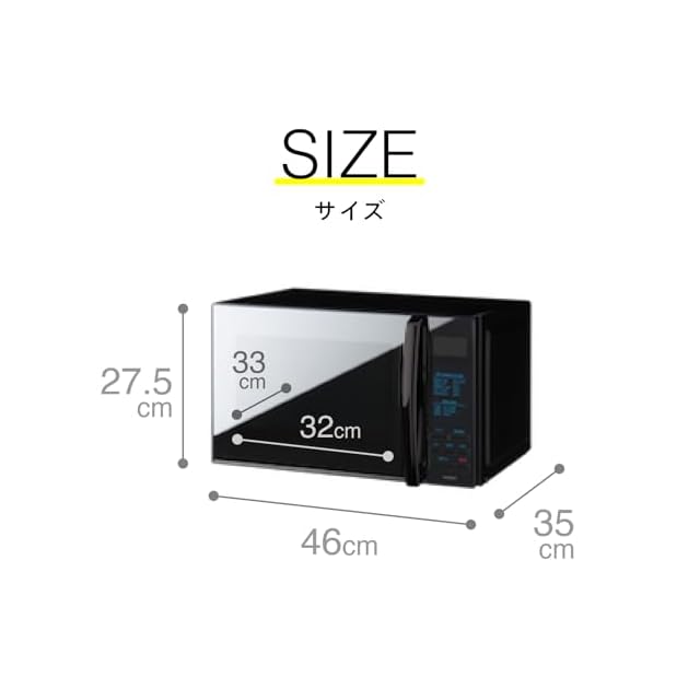 ■定格消費電力:900 / 1200 W ( 50 / 60 Hz ) ■製品サイズ:約45.8 × 34.9 × 27.0 cm ■庫内寸法:31.5 × 32.9 × 19.5 cm ■製品重量:約14 kg