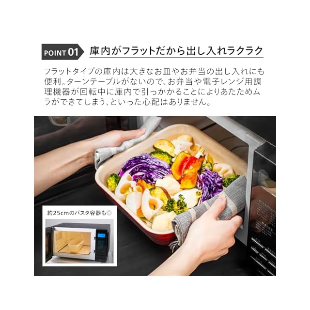 【便利なフラットタイプ】 庫内はターンテーブルのないフラット構造なので、コンビニ弁当などの大型の食材もあたためられます。さっと拭けて、お手入れもかんたんです。