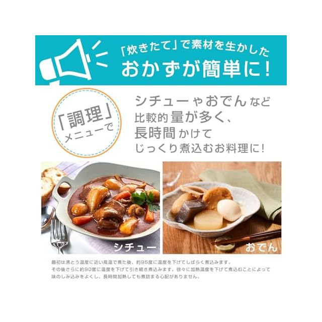 【炊飯器調理も】ローストビーフなどの低温調理も思いのまま。高温クッキングで、煮込み料理も簡単。レトルト食品の温めにも対応。