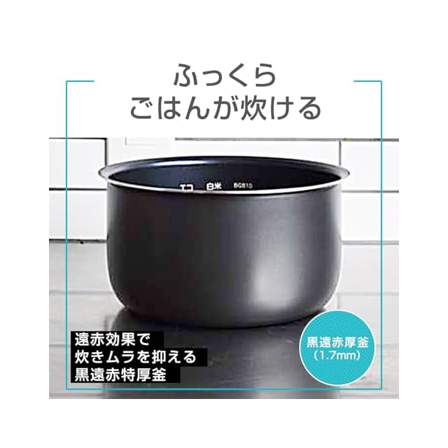 【ふっくらおいしい】「遠赤黒特厚釜(約3mm)」×「釜包み高火力炊きあげ」。高い蓄熱性と遠赤効果で炊きムラを抑え、お米の芯までおいしく炊きあげ。