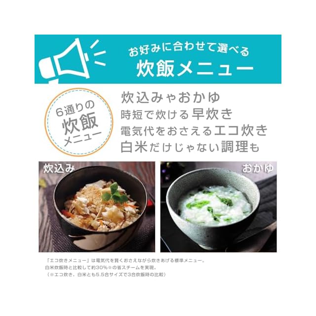 炊きわけメニュー「エコ炊き」「白米」「早炊き」「炊込み」「おかゆ」「調理」