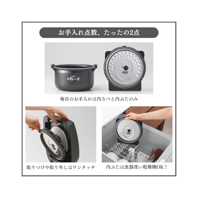 かまど火に近づく「釡包みIH」で加熱量をアップ。「可変W圧力」で大小2つの圧カボールを制御し、ごはん粒を炊きしめ。ごはんの甘さを引き出しつつ、べたつきをおさえたしっかりとしたごはん粒に仕上げます。