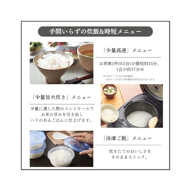 「少量旨火炊き」メニューで、少量でも旨みを引き出す加熱を実現。0.5合から2合まで「そのとき食べる分だけ」炊きたてごはんをおいしく食べられる。・便利な機能:「少量高速」&「冷凍ご飯」&「お弁当」メニューで忙しい毎日にも大活躍。・付属品:自立式しゃもじ、計量カップ、麦めしカップ1割用、麦めしカップ3割用 ・電源コード:(約)1.0m / 1回当たりの炊飯時消費電力Wh:171 / 1時間当たりの保温時消費電力量Wh:17.2