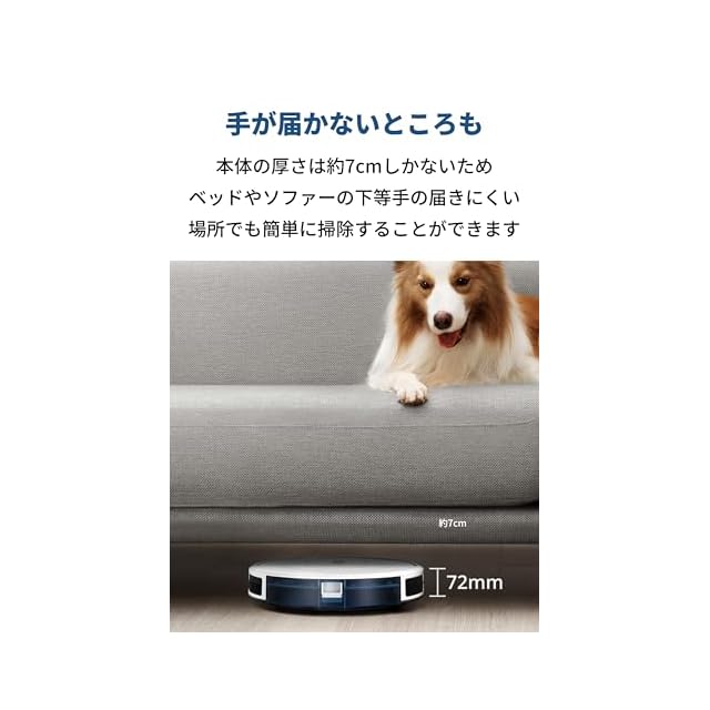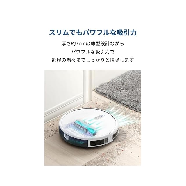 スリムでもパワフルな吸引力:厚さ約7cmの薄型設計ながら、パワフルな吸引力で部屋の隅々までしっかりと掃除します。