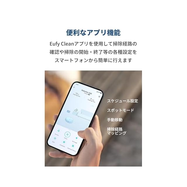 便利なアプリ機能:掃除の開始・終了のコントロールやスケュール設定等をEufy Cleanアプリから簡単に行えます。また、掃除経路をアプリ上に表示してどこを掃除したのか一目で確認することが可能です。