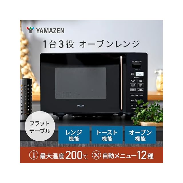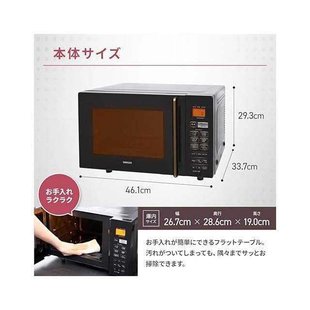 【商品仕様】▪本体サイズ:幅45.5×奥行33.5×高さ28.2cm▪本体重量:13kg▪庫内サイズ:幅29.7×奥行28.4×高さ18cm▪庫内容量:16L▪電源コードの長さ:約1.4m▪電源: AC100V(50/60Hz共用)▪消費電力:電子レンジ=980/1280W(50/60Hz)オーブン=1200W(温度調節:40℃(発酵)/110~200℃)グリル=1200W▪高周波出力:500W(50Hz)650W(60Hz)▪期間:お買い上げ日より1年間(の範囲については、取扱説明書をご確認ください。(一般家庭用以外(業務用など)に使用された場合の故障及び損傷などは対象外となります))