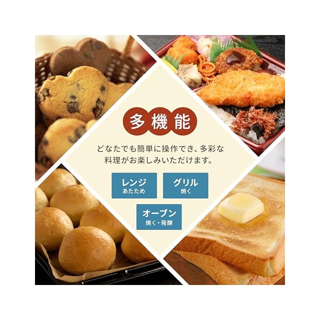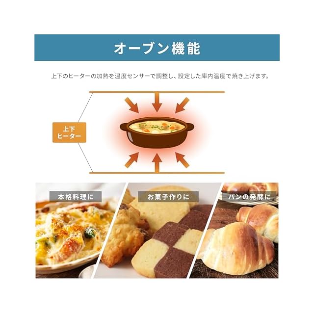【オーブン機能】最大200℃まで設定できるオーブン機能。上下のヒーターの加熱を温度センサーで調整し、設定した庫内温度で焼き上げます。グラタンやピザ、クッキーにスポンジケーキなど幅広いメニューが楽しめます。また、揚げ物をサクッと温め直すのにも役立ちます。オーブン機能は40℃に設定すると発酵モードになるので、自家製パンにも挑戦できます。
