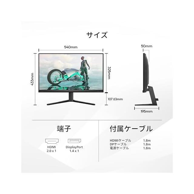 【付属品とケーブル】 DisplayPortケーブル(1.8m)、HDMIケーブル(1.8m)、電源ケーブル(1.8m)、クイックスタートガイド、書、ケーブル付属リスト、ベーススタンド、ベース支柱、VESAカバー。【本体サイズ(スタンドあり)(mm)】 433 (H) × 540(W) × 195 (D)、3.26kg。【安心サポート】 お買い上げより5年間無償修理(詳細は製品画像をチェック!)。