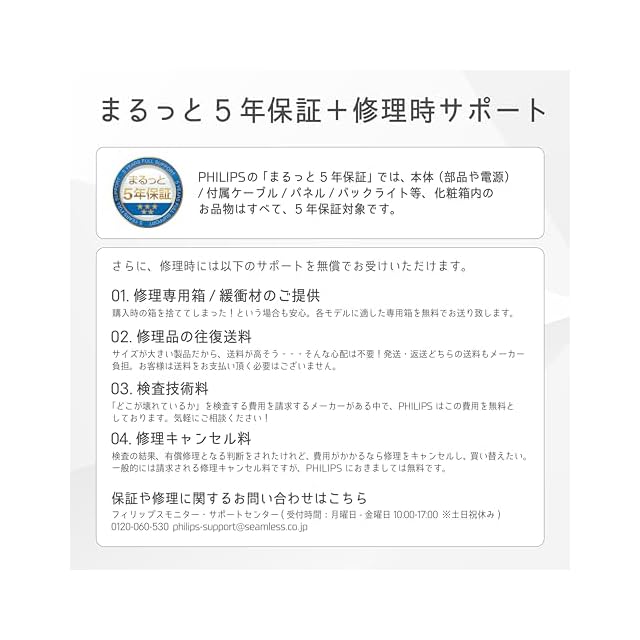 【付属品とケーブル】 DisplayPortケーブル(1.8m)、HDMIケーブル(1.8m)、電源ケーブル(1.8m)、クイックスタートガイド、書、ケーブル付属リスト、ベーススタンド、ベース支柱、VESAカバー。【本体サイズ(スタンドあり)(mm)】 463 (H) × 615(W) × 196 (D)、4.43kg。【安心サポート】 お買い上げより5年間無償修理(詳細は製品画像をチェック!)。