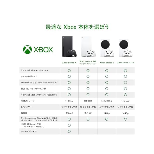 4 世代に渡る Xbox ゲーム ライブラリーから数千にもおよぶタイトルをもっともベストな環境でプレイできます。Series X の中核をなす Xbox Velocity アーキテクチャーは、カスタム SSD と統合されたソフトウェアを組み合わせ、ロード時間を大幅に短縮しながらより高速でスムーズなゲーム プレイを実現し。また、クイック レジューム機能で複数のゲーム間を瞬時にシームレスに切り替えることができます。12 テラフロップスの基本グラフィック処理能力による最大 4K 120 FPS の描画と、高度な 3D 空間サウンドで、豊かな新しい世界を探検したり、これまでにないアクションを体験することができます。