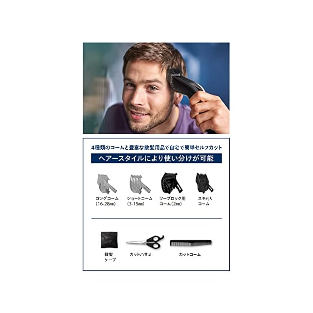 27段階の長さ調節でお好みの長さでヘアーカット.2 mm~28 mm のカットの長さより、 1 mm刻みで細かく長さを調節可能。 ※ツーブロック用コームを使用すると2 mm にトリミング。 ※コームを外すと 0.5 mm にトリミング。