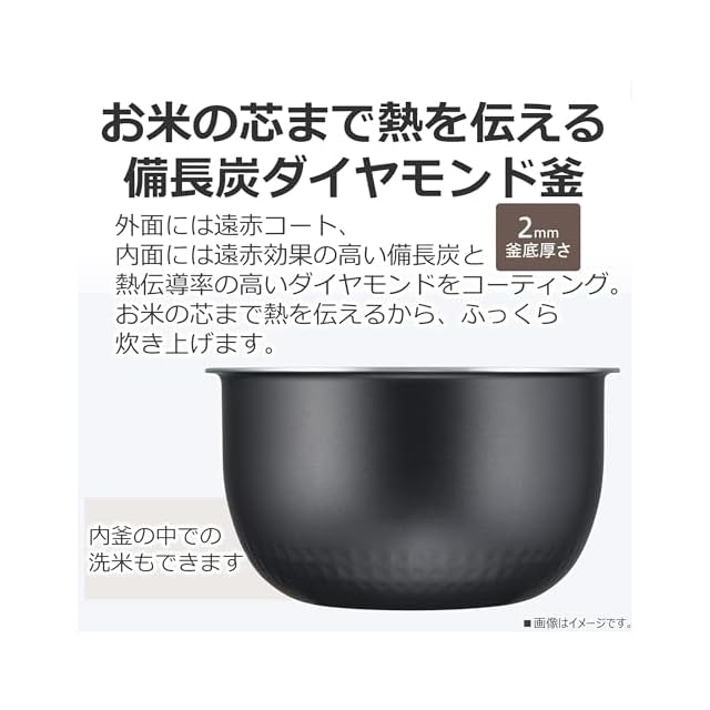 ✅【備長炭ダイヤモンド釜】外面には遠赤コート、内面には遠赤効果の高い備長炭と熱伝導率の高いダイヤモンドをコーティング。お米の芯まで熱を伝えるから、ふっくら炊き上げます。