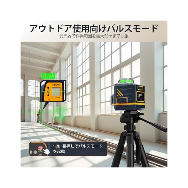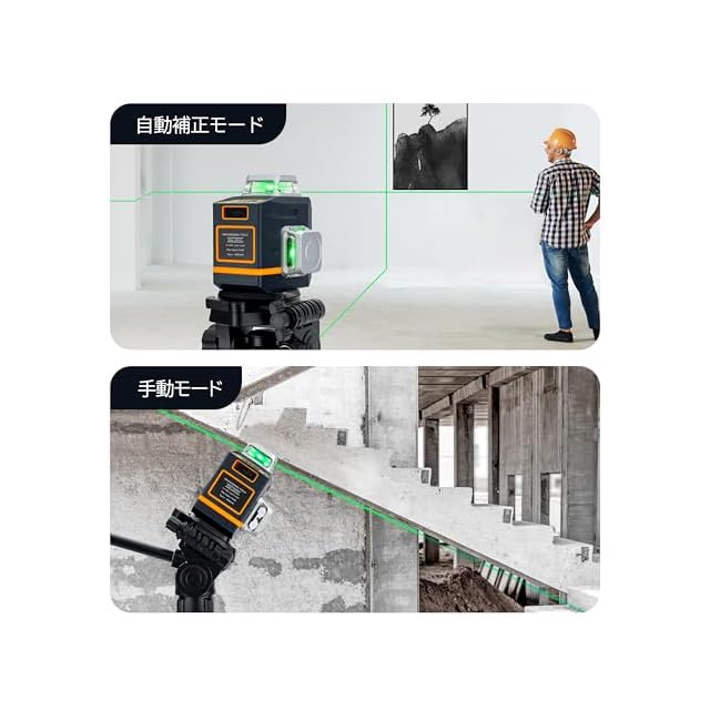3つのモードで多様な用途に対応:このグリーンレーザー墨出し器は、以下の3つのモードを備えています。自動調整モード: 平坦な面で自動的に水平を確保し、簡単かつ正確なセットアップが可能です。手動モード: 角度を自由に設定できるため、複雑なレイアウトや創造的なプロジェクトに対応します。パルスモード: 明るい環境でもレーザーの視認性を高め、受光器を使用することで作業範囲を30mから50mまで拡大可能。屋外作業や大規模な室内作業に最適です。